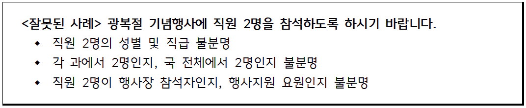 - 감정적이고 위압적인 표현을 쓰지 않는다. 상급기관이 하급기관에 보내는 문서에 "········ 할 것", "······· 하기 바람" 등과 같이 위압감을 주는 문구를 쓰게 되면 조직 상하 간의 관계를 경직시켜 원활한 의사소통에 지장을 초래하기 쉽기 때문에 바람직하지 않다. 조직구조상 지위·감독 관계에 있다 하더라도 상호 간에 존중한다는 의미에서 "····· 하시기 바랍니다."와 같은 표현을 사용하는 것이 좋다.