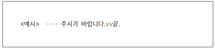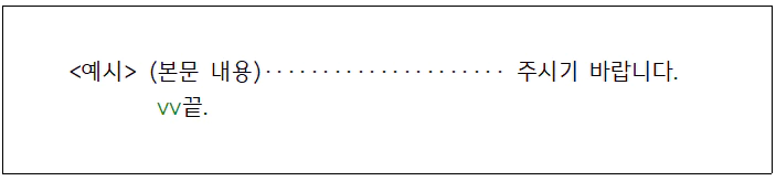 3. 본문 또는 붙임 표시문이 오른쪽 한계선에서 끝났을 경우에는 그 다음 줄의 왼쪽 기본선에서 한 글자[작게*2타*] 띄우고 [**끝**] 표시를 한다.