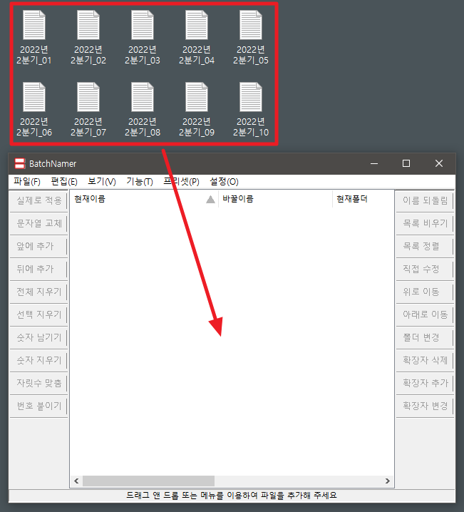 1. BatchNamer 프로그램이 켜진 상태에서 파일을 끌어서 놓는다.
