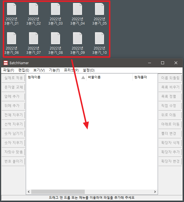 1. BatchNamaer 프로그램이 켜진 상태에서 파일을 끌어서 놓는다.