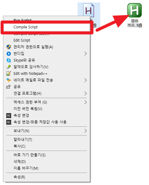 [작게* *에디터 도구-컴파일하거나, *. ahk 파일 위에서 오른쪽 클릭해서 나오는 Compile Script를 누르면 같은 장소에 실행파일이 생긴다.*]