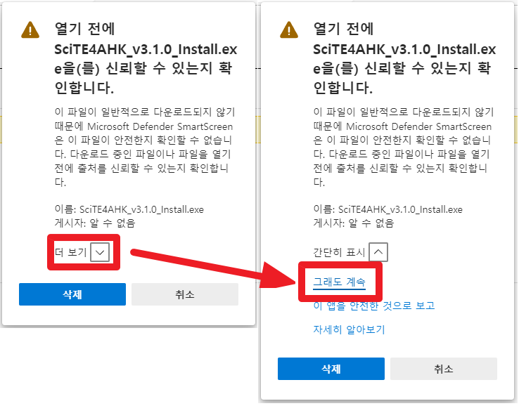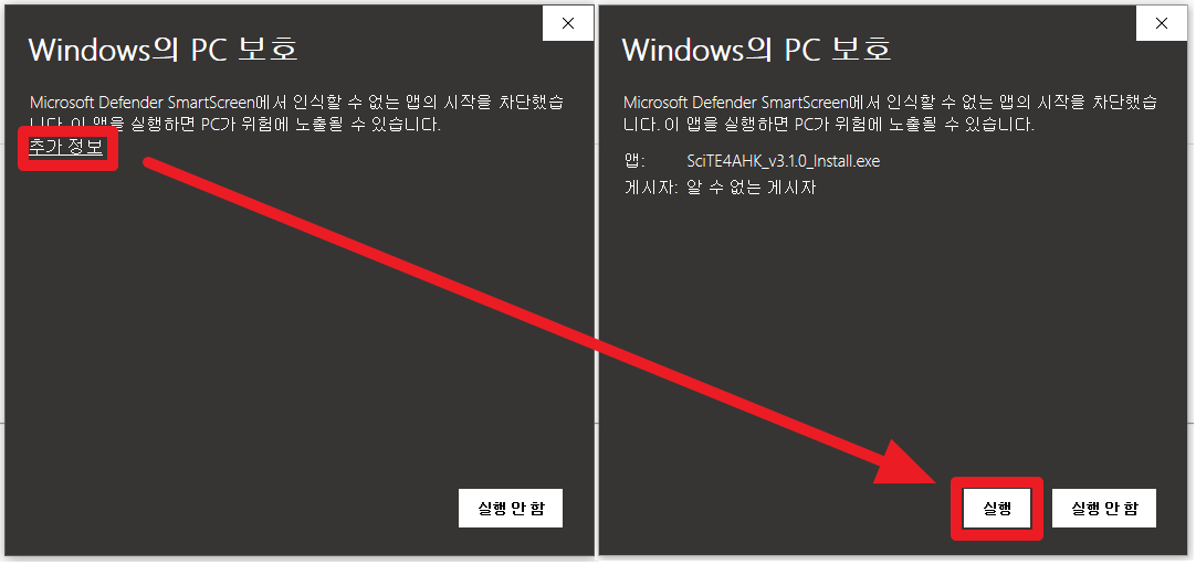 [작게* *윈도우보호 관련 메시지가 뜰 수 있으며, 사용자 계정 컨트롤러 화면이 나오면*] [**예**][작게*를 누르고 넘어간다.*]