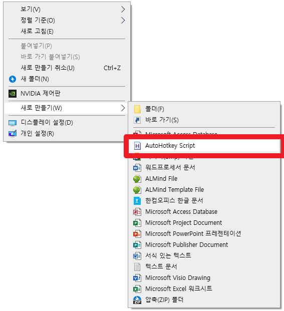 1. 바탕화면에서 오른쪽 클릭-새로 만들기-AutoHotKey Script를 선택한다.